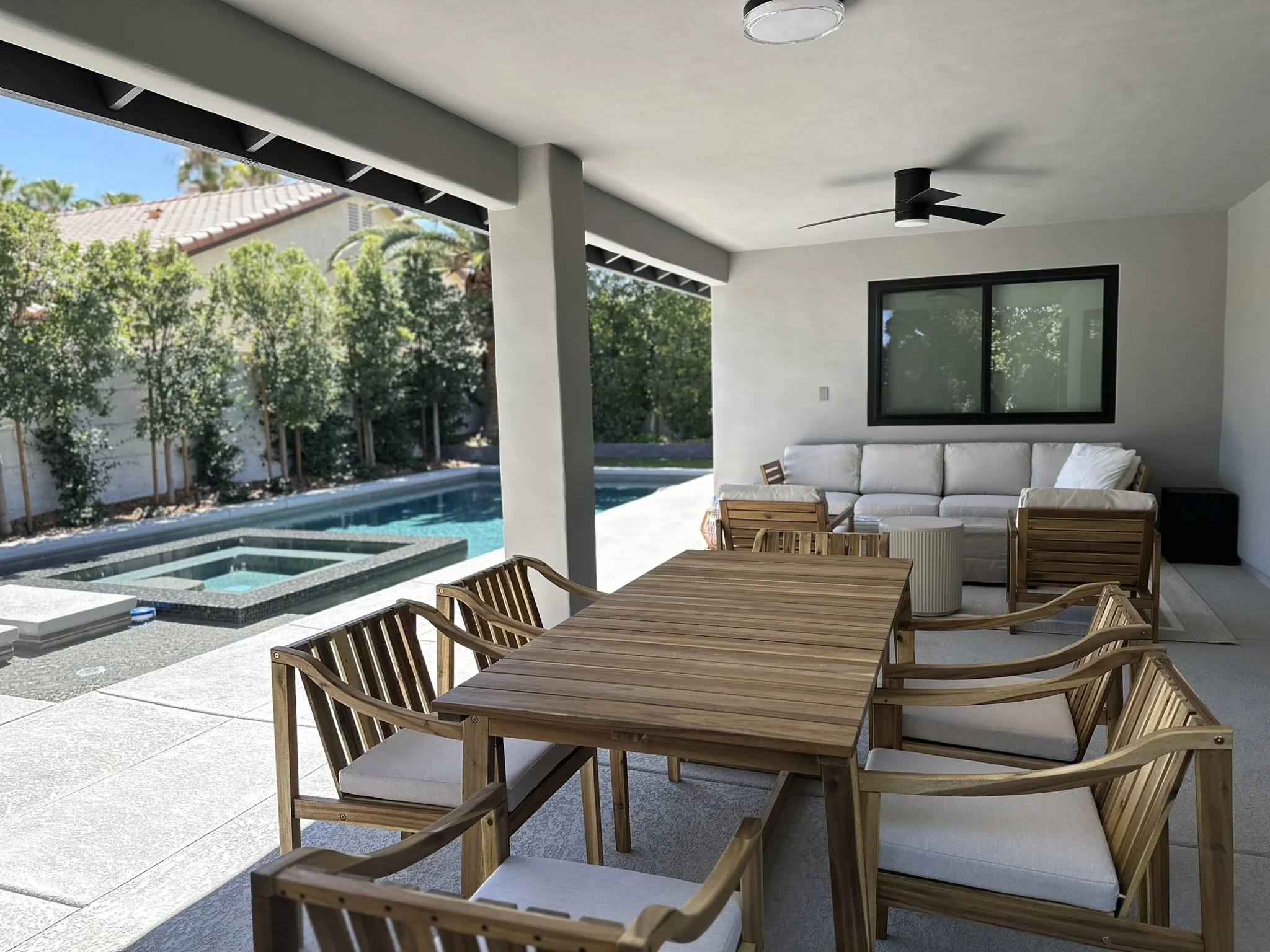 Outdoor Amenities: The backyard boasts a covered patio, heated pool, spa, artificial turf, and mature landscaping, providing an attractive backdrop for photography and videography.